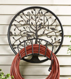 Details: Plow & Hearth Exclusive - Mount our Tree of Life Metal Hose Holder to the side of your home or shed to tidy up your yard. This attractive and functional hose holder is made of durable metal and features a beautiful tree of life design in a black finish with golden highlights. Holds 50-100' of hose depending upon hose diameter. Size: 22¾" dia. x 9"D. Style: Tree of Life; Black Finish with Golden Highlights.